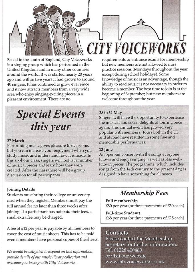 11.- City Voiceworks has had the same number of members for many years. 12.- If you want to become a member of City Voiceworks, you have to pass a test. 13.- When you first become a member, you are expected to attend all the practice sessions. 14.- You can join the City Voiceworks in the first days of September or whenever you want. 15.- On 27 March, members Hill have the opportunity to create their own piece of music. 16.- It may be possible to visit other countries with the singing group. 17.- The open-air concert will include favorite songs and songs we are not so familiar with. 18.- If you want to pay £68 a year, you have to show a document that says that you are a student. 19.- Every one must pay a £12 music fee except members who own copies of the sheet music. 20.- You are advised to go to the City Voiceworks website rather than phone their secretary.